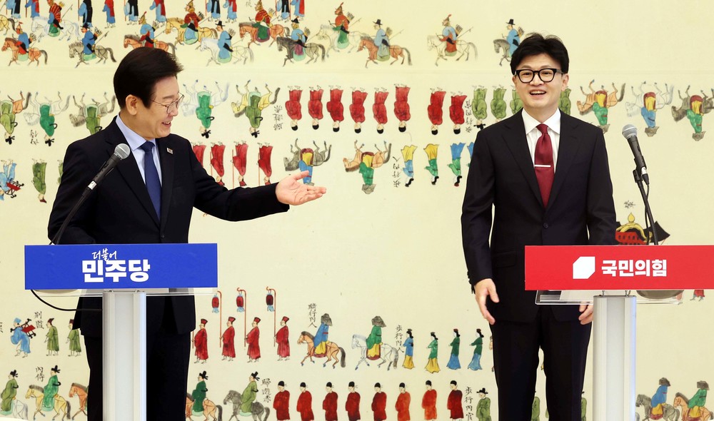![]() 한동훈 국민의힘 대표와 이재명 더불어민주당 대표가 1일 서울 여의도 국회에서 열린 국민의힘-더불어민주당 당대표 회담에서 모두 발언 순서를 서로 양보하며 미소 짓고 있다. 사진=뉴시스 |