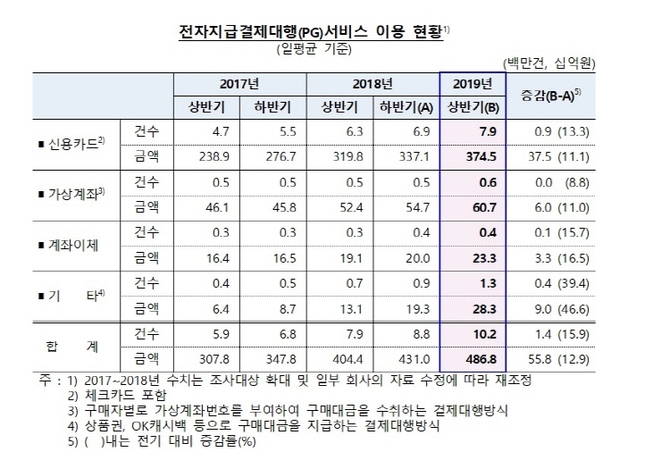 또 전자지급결제대행서비스(PG)는 온라인 쇼핑이 증가하면서 카드기반 서비스를 중심으로 이용건수가 15.9%, 금액은 12.9% 증가했으며 선불전자지급서비스는 간편송금서비스를 제공하는 상위업체를 중심으로 이용규모가 크게 증가하면서 이용건수 6.0%, 금액 52.7% 증가했다.