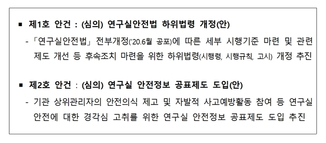 과기부는 지난달 '연구실 안전 환경 조성에 관한 법률 전부개정'이 공포됨에 따라 하위법령 개정(안)과 '연구실 안전정보 공표제도 도입안' 등 2건을 이날 상정했다.