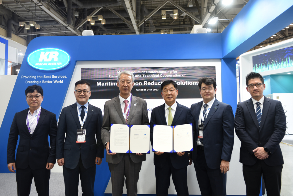 [이코노믹포스트=이석균 부장] KR(한국선급, 회장 이형철)은 부산 벡스코에서 열리고 있는 코마린 2023에서 HD현대글로벌서비스(대표이사 이기동)와 함께「조선/해양 탄소저감 솔루션 실증 및 기술협력」을 위한 업무협약을 지난 24일 체결했다고 밝혔다.