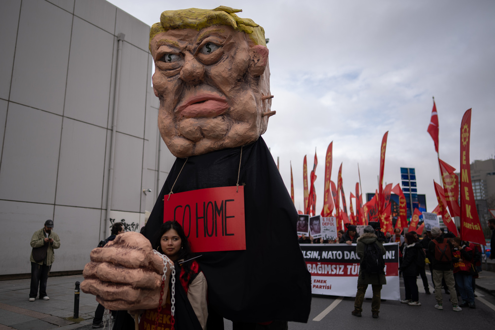 ![]() 4일(현지시간) 토요일, 터키 이스탄불에서 열린 반나토 시위에서 시위대가 도널드 트럼프 미국 대통령의 인형을 들고 행진하고 있다. AP |